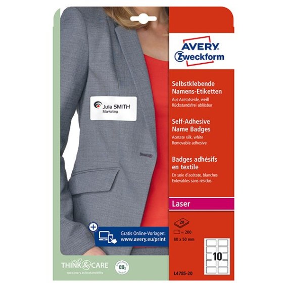 Avery Zweckform Identyfikatory samoprzylepne 80mm x 50mm, A4, białe, 10 etykiety, samoprzylepna/y, pakowane po 20 szt., L4785-20