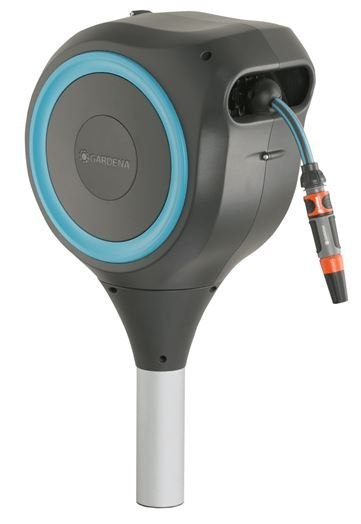 się i brudzenia dłoni podczas chowania węża: krótkie pociągnięcia za wąż aktywuje wbudowaną sprężynę, która zwija go w pełni automatycznie i niezawodnie. Aby wąż nie skręcał się i nie blokował, prowadnica układa go w bębnie, a technologia RollControl kontroluje i reguluje zwijanie. Bęben dostosowany jest do wysokości GARDENA robotów koszących, które bez trudu wykoszą trawę wokół niego. Wysokiej jakości tworzywo odporne na promieniowanie UV i mróz sprawia, że bęben można pozostawić w ogrodzie przez cały rok. Duża trwałość jest gwarantowana, bez dodatkowej konserwacji. Bęben jest kompaktowy i stylowy, przez co pasuje do każdego ogrodu. W komplecie do bębna ogrodowego dołączony jest giętki wąż przyłączeniowy, wszystkie części i elementy Original GARDENA System niezbędne do montażu, a także zraszacz prosty, wytwarzający dwa rodzaje strumienia wody. GARDENA udziela na bęben ogrodowy RollUp S pięcioletniej gwarancji.