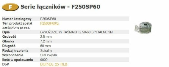 Numer katalogowy F250SP60 Ten produkt został zastąpiony przez: F250SP60Q Opis GWOŹDZIE W TAŚMACH 2.50-60 SPIRALNE 9M Grubość 2.5 mm Główka 7.2 mm Długość 60 mm Rodzaj trzpienia Spiralny Wykończenie Stal zwykła Ilość w opakowaniu 9000 DoP DOP-EU_25_RLB
