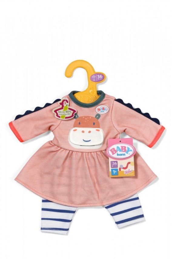 BABY born Sukienka Jungle z Pasiastymi Legginsami - uroczy, dwuczęściowy zestaw dla lalek BABY born o wysokości 36 cm. Zestaw składa się z sukienki z motywem dżungli oraz pasujących, kolorowych legginsów. Sukienka posiada zabawny detal - otwierającą się paszczę hipopotama, który dodaje stylizacji wyjątkowego uroku. Delikatnie dopasowany krój sprawia, że strój idealnie pasuje do lalek 36 cm, zapewniając realistyczną i kreatywną zabawę w ubieranie i odgrywanie scenek. Lalka nie jest dołączona.