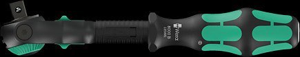 Grzechotka Zyklop 3/8". Wysokiej jakości wytrzymała powierzchnia, matowa, chromowana w kolorze czarnym. Drobna podziałka z 72 zębami zapewniająca niewielki kąt pracy wynoszący zaledwie 5°. Główkę grzechotki można swobodnie obracać i blokować w dowolnej pozycji za pomocą przełącznika suwakowego znajdującego się z obu stron narzędzia. Bezproblemowa praca nawet w bardzo wąskich lub trudno dostępnych miejscach. Możliwość ustawienia w pozycjach 0°, 15° i 90° w lewo i w prawo gwarantuje bezpieczną pracę bez ryzyka ześlizgnięcia się główki grzechotki. W pozycji 0° grzechotka z adapterem i bitem może być używana jak konwencjonalny wkrętak. Konstrukcja wykorzystująca masę własną narzędzia przyspiesza proces wkręcania. Symetryczna konstrukcja rękojeści Kraftform i tulei obrotowej wspomaga szybkie pokręcanie. Kształt rękojeści Kraftform, który jest idealnie dopasowany do dłoni, zapobiega powstawaniu pęcherzy i odcisków. Twarde materiały użyte do wykonania rękojeści umożliwiają szybkie uchwycenie narzędzia bez "przykleja