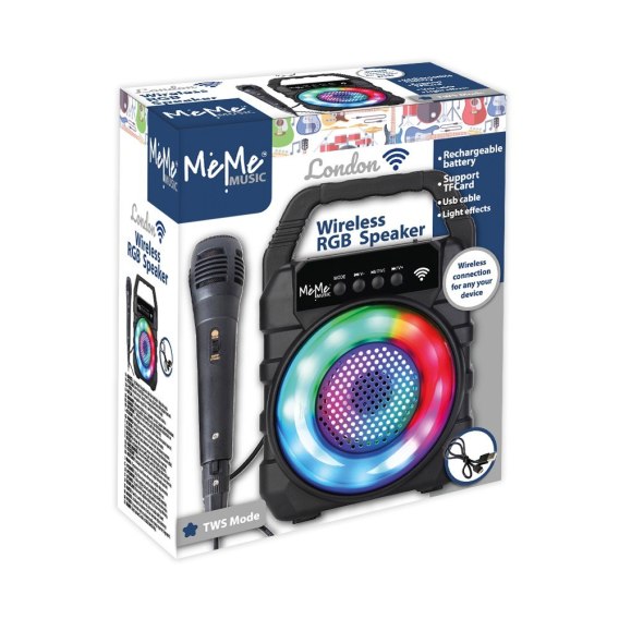 Bezprzewodowy wzmacniacz z efektami świetlnymi LED oraz mikrofonem. Wzmacniacz posiada gniazdo ładowania, karty TF, USB oraz mikrofonu. Możliwość odtwarzania radia. Przycisk odtwarzania i pauzy. Wybór następnego/poprzedniego utworu. Regulacja głośności. Możliwość połączenia dwóch wzmacniaczy.