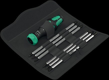 7-częściowy zestaw trzpieni wymiennych. 1 rękojeść Kraftform z gniazdem sześciokątnym 6 mm do trzpieni wymiennych (dwustronnych) z serii Wera Vario. Drobnozębna grzechotka zintegrowana z rękojeścią zapewnia szybką pracę. Intuicyjna zmiana kierunku pracy: obrót pierścienia przełączającego w prawo powoduje zmianę kierunku pracy w prawo, obrót pierścienia przełączającego w lewo powoduje zmianę kierunku pracy w lewo. Mechanizm zapadkowy można zablokować w pozycji 0 dla zapewnienia precyzyjnej pracy. 2-komponentowa rękojeść Kraftform z kombinacją strefy twardej i miękkiej umożliwia pewny chwyt i precyzyjną pracę. 6 dwustronnych trzpieni Wera Vario (= 12 różnych profili), długość 175 mm, sześciokąt 6 mm. W składanym, wytrzymałym etui.