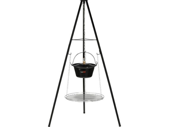Opis produktu Przenośny grill węglowy na trójnogu z rusztem i kociołkiem zamykanym pokrywą. Dwie opcje podgrzewania pozwalają przygotować różne rodzaje potraw w tym samym czasie lub osobno. BUDOWA I CECHY: - 2w1 - grillowanie na ruszcie i gotowanie w kociołku - chromowany ruszt jest lekki, wtrzymały, łatwo się czyści i zapewnia długie użytkowanie. Dodatkowo ruszt ma wysokie ranty zapobiegające spadaniu jedzenia. Możliwość - zawieszenia rusztu na 2 sposoby - do regulowanego łańcucha lub do trójnogu - stalowa, emaliowana misa (kociołek) z pokrywą utrzymującą odpowiednią temperaturę oraz uchwytem do przenoszenia lub zawieszenia - grube, stalowe łańcuchy - regulacja wysokości rusztu za pomocą łańcucha umożliwia lepszą kontrolę nad grillowanymi potrawami - 3 metalowe, stabilne nogi stojaka - stal malowana proszkowo
