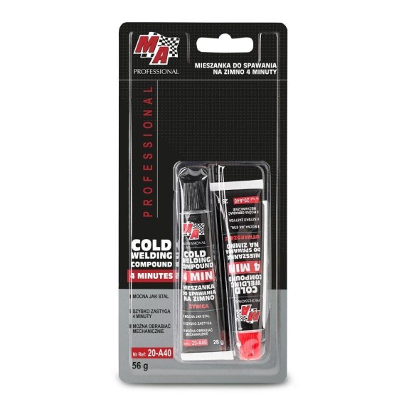 Mieszanka MA Professional to szybko utwardzająca się masa epoxydowo-stalowa przeznaczona do naprawy uszkodzonych/pękniętych przedmiotów wykonanych z różnych stopów metali, drewna, wyrobów ceramicznych, wyrobów z tworzywa sztucznego i wielu innych materiałów. Skutecznie reperuje pęknięte bloki silnikowe, chłodnice, obudowy podzespołów mechanicznych oraz szereg innych elementów. Produkt tworzy bardzo twarde spoiwo odporne na działanie temperatur do 150oC. oraz jest odporny na działanie olejów samochodowych, przekładniowych i hydraulicznych, benzyny, wody oraz wielu innych substancji. Wstępne utwardzenie po upływie od 4 do 10 minut w zależności od temperatury otoczenia. Po jednej godzinie produkt jest utwardzony w 80%. Pełne utwardzenie po 24 godzinach.