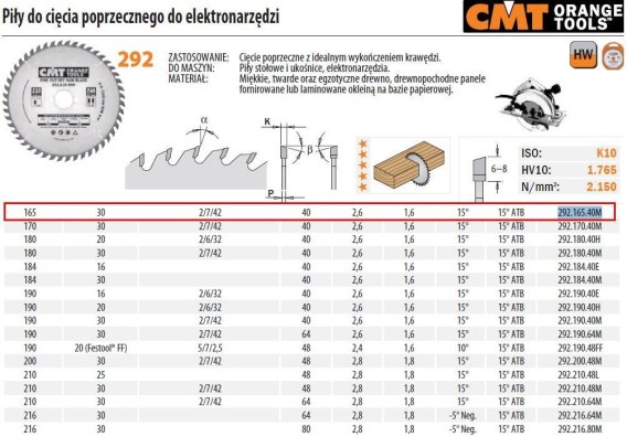 PIŁA DO CIĘCIA POPRZECZNEGO, OBRÓBKA WYKAŃCZAJĄCA HM 165x30x2,6/1,6 Z=40