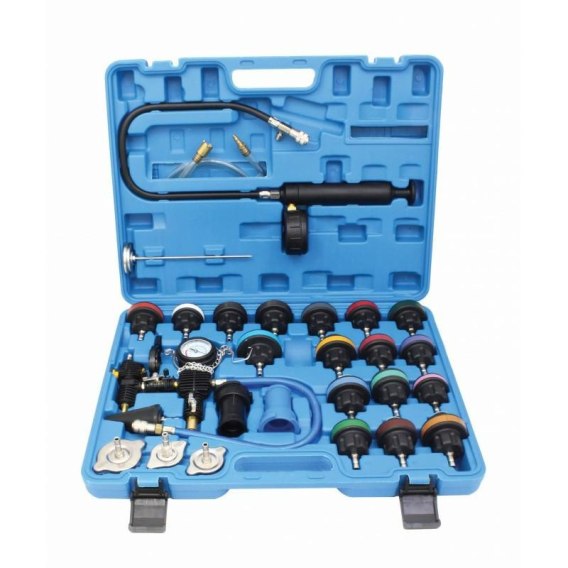 27 elementowy zestaw do testowania przecieków w chłodnicy, a tak że dokonania szybkiej zmiany chłodziwa. Oznaczone różnymi kolorami nakrętki ułatwiają wybór odpowiedniego korka testowego. W zestawie: -Pompka z wężem o zakresie pomiaru 0 - 35 psi (0 - 2,5 bar), -Urządzenie do przedmuchu systemu chłodzącego, -17 szt. nakrętek o różnym kolorze, -Uniwersalny adapter gumowy, -Wskaźnik temperatury, -Cienki wąż, -Wąż płynu chłodzącego, -Złączki (czarne i niebieskie) Zastosowanie: Jeep. Peugeot, Subaru, Chrysler, Acura, Mitsubishi, Nissan, Mazda, Toyota, Infiniti, Suzuki, Isuzu, Honda, Lexus, Volvo,Saab, Citroen, Renault, Fiat, Alfa, Mini Cooper, VW, BMW, Ford , Opel, Porsche, Audi, Mercedes - Benz, Dodge, Pontiac, Chevrolet,GEO, GM, KIA, Land Rover, Ssangyong