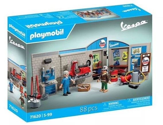 Garaż Vespy PLAYMOBIL jest doskonale wyposażony w wiele akcesoriów. Z ruchomym podnośnikiem i miejscem na Vespę. Opony Vespy można zdjąć w celu ich wymiany. Korzystając z różnych siedzeń można zmienić wygląd Vespy.